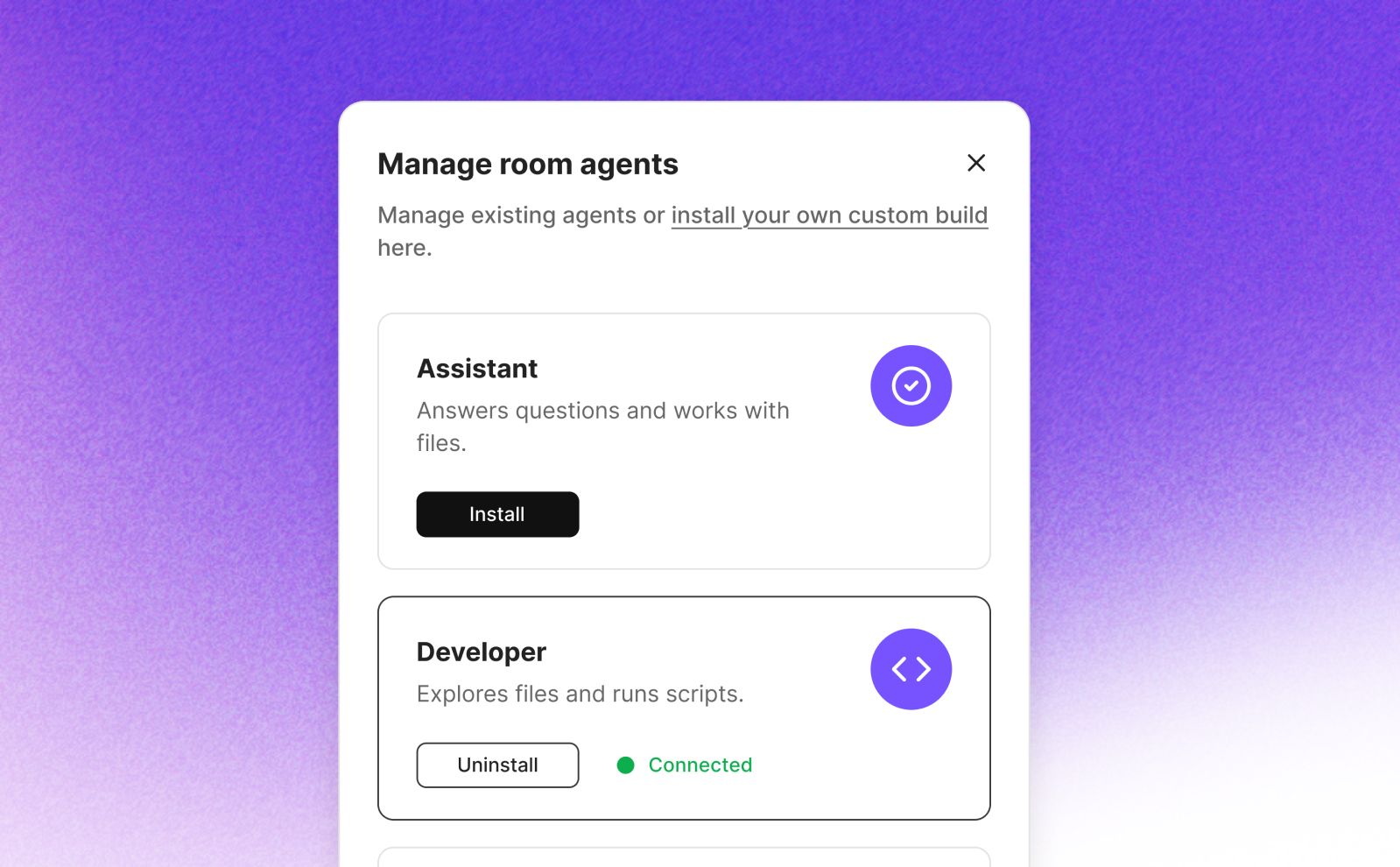 Browse prebuilt agents or bring your own, install them with one click, and use them in shared Rooms as work evolves.