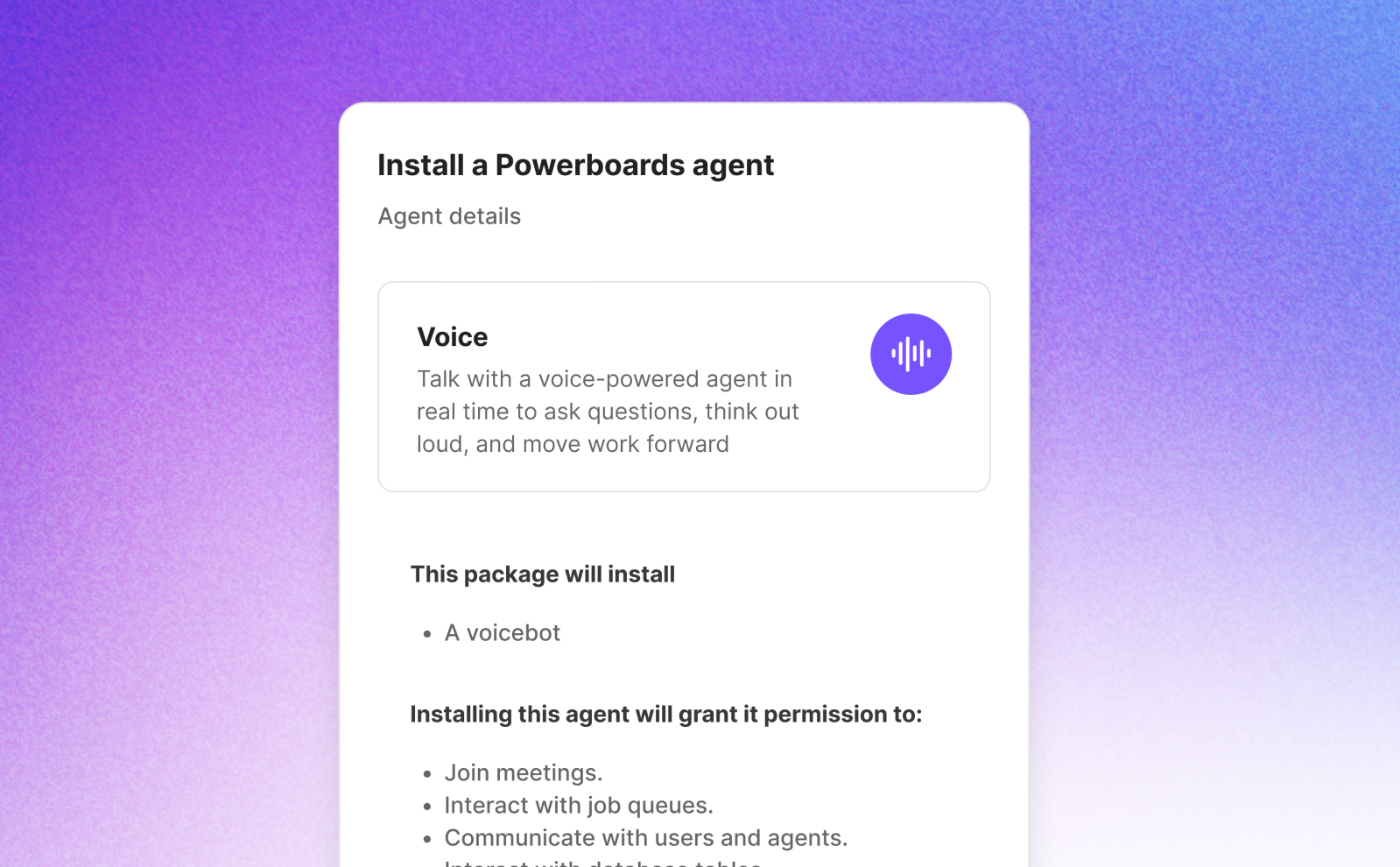 Powerboards provides clear visibility, permissions, and audit history as usage increases. Teams know which agents are running, who can access them, and how work is being done.